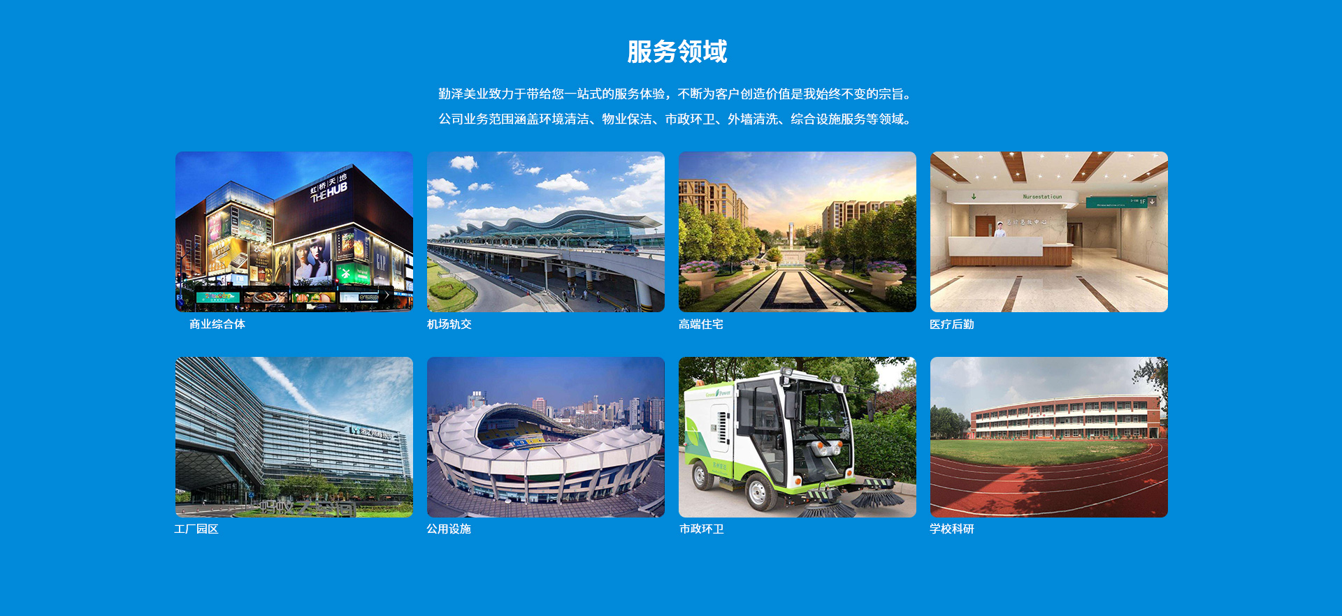 公司致力于把“勤澤美業(yè)”培育成眾口皆碑、令人尊敬、具有長期價值的服務(wù)領(lǐng)袖品牌。業(yè)務(wù)范圍涵蓋環(huán)境清潔和綜合設(shè)施管理服務(wù),公司具備環(huán)衛(wèi)、保潔、石材等多個行業(yè)一級資質(zhì),致力成為中國環(huán)境服務(wù)行業(yè)的領(lǐng)導者。